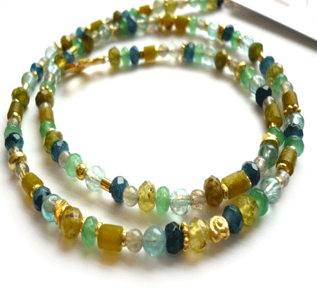 und kreativ in Form gebracht: glänzende oder matt geschliffene Edelsteine, Zwischenteile aus 925 Sterling Silber, zum Teil vergoldet. Glasperlen, Swarovski-Kristalle, Roccailles, verschiedene Formen von Muschelperlmutt und Zuchtperlen.
